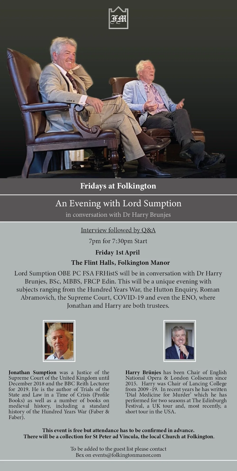 Folkington Manor (map) Folkington East Sussex BN26 5SD ✚ gCal ✚ iCal BOOK LORD SUMPTION EVENT Name * First Name Last Name Email * No. Tickets Required * 1 2 3 4 5 6 7 8 Message Thank you!